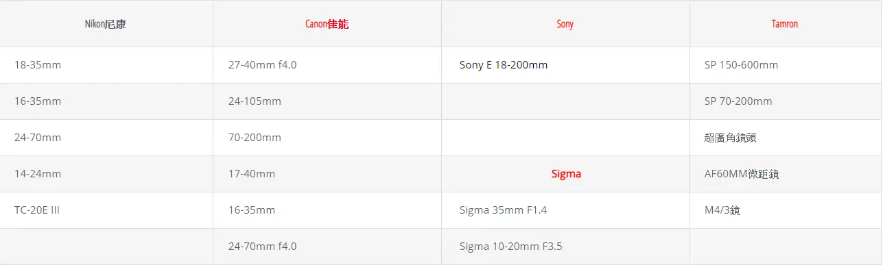 各大廠牌相機鏡頭